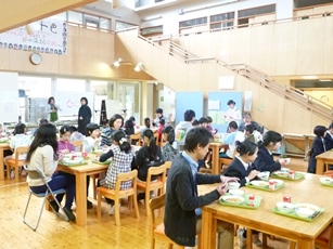 今日から給食が始まりました。今日の献立は「ごはん・牛乳・ブラウンシチュー・ほうれん草のソテー」です。本校では、1・2月以外は週に1回クラスで食べますが、それ以外の日は「みんなのリビング」で全校児童生徒が集まって食べます。1年生にとっては初めての給食です。みんなでおいしくいただきました。