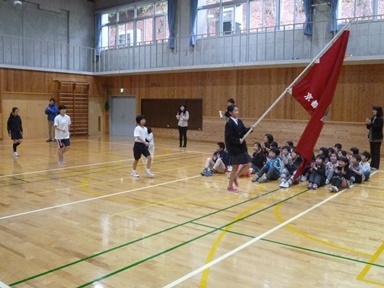 給食後の昼休み、体育館で春季大会壮行会をおこないました。中学校課程の7〜9年生が行進して体育館に入場しました。入場後、大会に出場する8年生から決意の言葉、そのあと校長先生と児童代表から激励の言葉がありました。今年の春季大会には、8年生が陸上競技の部に出場します。昨年、9年生が引退した後は、一人で頑張ってきました。今まで頑張ってきた練習の成果をぜひとも発揮してほしいものです。健闘を祈っています。児童生徒・保護者・地域の皆様、応援のほどよろしくお願いいたします。