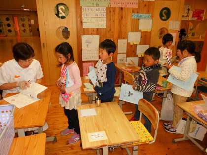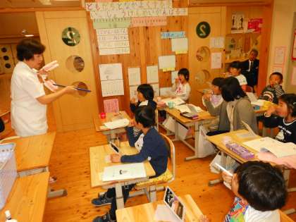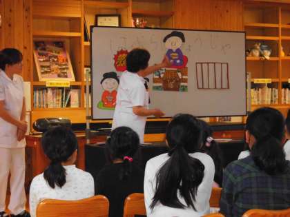 歯科衛生士さんにお世話になって,歯の健康教室が開かれました。はじめにすばらしい手品を見せてくださって子どもたちの緊張をほぐしていただいた後、「はぶらし長者」のお話で歯磨きの大切さを教えていただきました。その後,歯の染め出しをして,どこがきちんとみがけていないか確かめました。自分で鏡を見て「ここがいっぱい赤く残っているから磨けてないんや」と子どもたちも自分の磨き癖が分かったようです。歯磨き調べを持ち帰りますので,おうちでも見ていただいて,仕上げ磨きなどの参考にしてください。