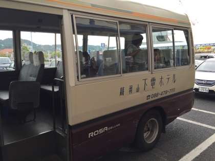 児島駅に着きました。下電ホテルの送迎バスの方に出迎えてもらって出発です。今からホテルの前に鷲羽山展望台に向かいます。