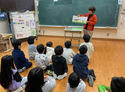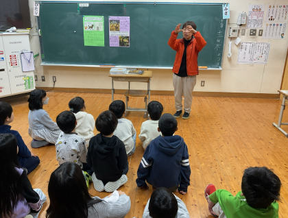 一期では、先生からの本の紹介がありました。今回は英語に関する本を紹介してもらいました。日本語と英語を比べて読むことができる本で一期の子どもたちでも楽しめる本でした。日本語と英語の動物の鳴き声の違いなども本に載っていて、子どもたちはとても興味関心をもって聞いていました。
