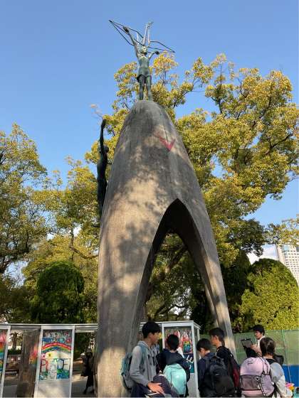 佐々木禎子さんをモデルにした原爆の子の像へ折り鶴を捧げました。
