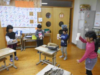 生活科の秋見つけで集めた秋のものでおもちゃを作り、みんなで遊びました。終わったあと「2年生にも遊んでもらおう」ということで、2年生も一緒にもう一度遊びました。それぞれ工夫したところを2年生に見つけてもらえて、楽しいひとときでした。