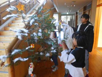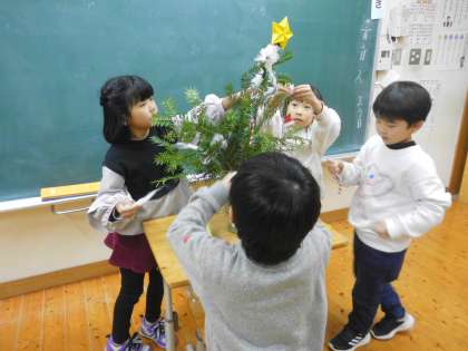 冬の教室飾りはもちろんクリスマス。そのために校務支援員さんが本物のもみの木をもってきてくださいました。もみの木のクリスマスツリーに飾りをつけて、わくわくしながらクリスマスを待っている子どもたちです。