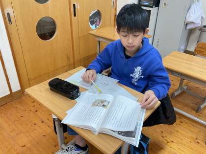 6年生では、国語の学習で「ぼくのブック・ウーマン」という単元に取り組んでいます。いくつかの課題の中から、自分がより深めたいものを選び、教科書の叙述をもとに自分なりにまとめました。その後、仲間と考えを共有し合いました。どの意見も叙述に基づいており、仲間から学ぼうとする姿勢が感じられました。