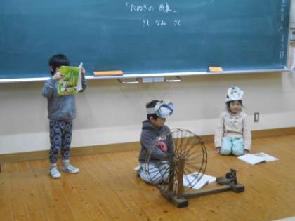 2学期最後の音読発表会をしました。糸車を回すおかみさんと、おかみさんの代わりに糸車を回すたぬきの、ほのぼのとした心あたたまるお話です。糸車を回したり、わなにかかったふりをしたりと、役を交代して動作化を入れながらの音読で、お客さんから思わず笑顔がこぼれる発表でした。「はじめのころと全然違って上手になってますね。」「成長しましたね。」「大きな声で読めましたね。」など、おほめの言葉をたくさんもらって、達成感をもって2学期の国語の学習を終えることができました。おうちでもたくさん聞いていただき、ありがとうございました。