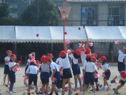 1年生にとっては,かごがとても高いと思っていることでしょう。でも,かごに入れようと夢中になって玉を投げています。「コンピュータおばあちゃん」の曲に乗って楽しくダンスをしながら入場します。