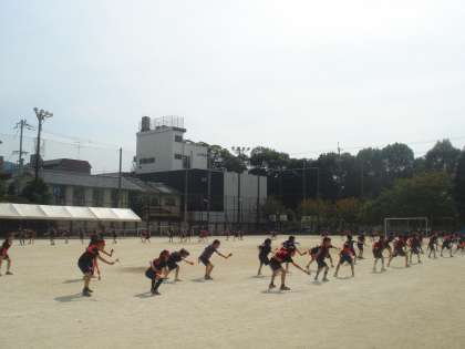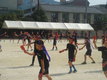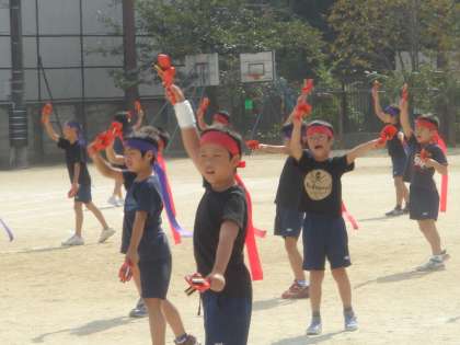 黒のTシャツに長いはちまき。お揃いの衣装で,威勢のよい掛け声とともに力強く踊ります。途中で隊形を変えるところもスムーズになりました。