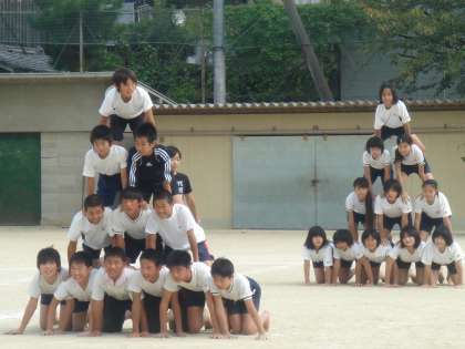 小学校最後の運動会になった6年生は,毎年恒例になっている組体操を取り入れて,みんなで美を演出します。プログラムの最後を飾る種目にふさわしい6年生の姿は,心を打つものがあります。一人では見せることのできない美しさを見せたいと,みんなの気持ちを合わせて精一杯練習を重ねてきました。
