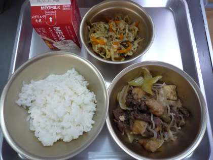 きょうの献立は「ごはん・牛乳・すきやき風煮・ごまず煮」でした。すきやき風煮は,これから冬によくでてくる献立です。急に寒くなりましたが,寒い時期には,家でも鍋料理や煮込み料理などをされることが多いのではないでしょうか。ごはんにもよく合う味でごはんもすすみました。ごまず煮は,くきわかめが入っていて,さっぱりとした酢の味がおいしかったです。