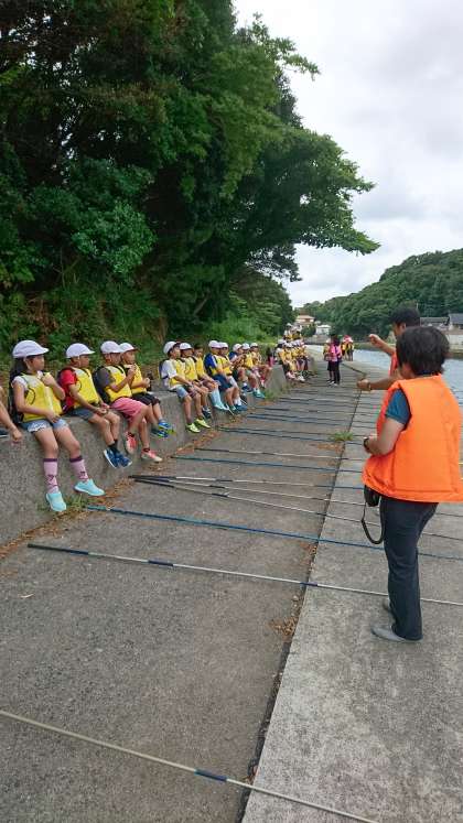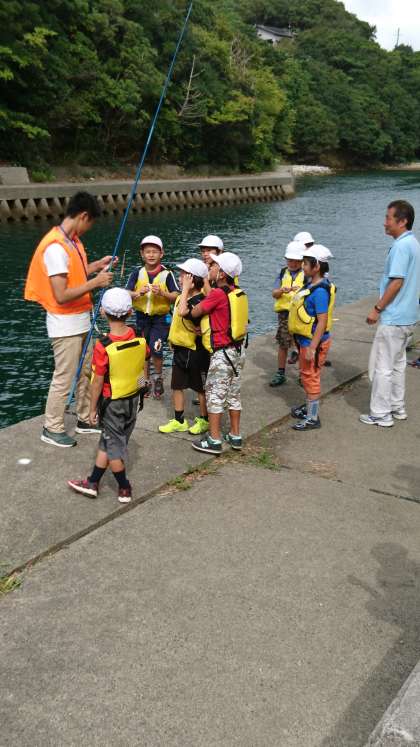 お楽しみの魚つりです。みんな緊張して説明をきいています。