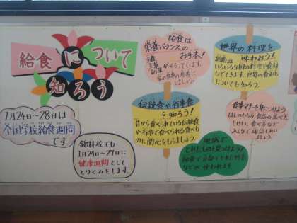 職員室横の廊下の掲示を子どもたちはよく見ています。今月の24日から28日は給食週間になっているので「給食について知ろう」という掲示になっています。保健室の前には,「インフルエンザ予防に向けて」・「からだのことわざ」・「まちがいさがし」などが掲示してあります。目に留める掲示物は,その時に獲得する情報として大事です。