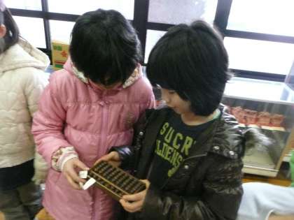 写真(上)は五つ玉のそろばんをつかっている様子です。写真(下)は,硬貨をかぞえる道具です。ばらばらの5円玉を50個入れてふるときれいに収まります。子どもたちもこの道具に興味をもった子どもが多く実際に試していました。