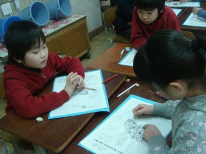 「想像をふくらませて物語を書く」学習があります。一枚の地図から宝物を探しに出かける途中にはいろんな動物が待ち構えていて,どのようにして宝箱までたどり着くかという設定です。子どもたちは自分なりの思いを巡らして物語を書くのですが,書くためにはまず構想メモを作り,「はじめ・なか・おわり」を意識したお話の筋を考えます。主人公の人物像や動物との対決など冒険物語は子どもたちをわくわくさせ意欲につながる学習です。研究授業では,自分の考えた構想メモを交流して,お互いにアドバイスし合う時間でした。とてもうまく交流ができていました。