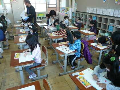 今日の午後に新入学児童の半日入学がありました。新入学児童は本の広場で現1年生から歌と言葉の歓迎をうけました。その後,各教室に分かれて絵を描いたり折り紙をしたりして一足早く1年生気分を味わいました。