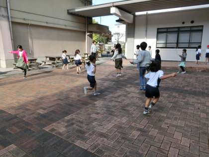 中庭は,なわとびを楽しむ子どもたちでいっぱい。様子を見に行くと,何人もの子が「校長先生,見て!見て!」と,日頃の練習の成果を披露しに来てくれます。どの子も,本当に楽しそう。とんだ回数や技の種類を,友達と比べあっている子もいます。担任の教員も一緒になわとびを楽しむ姿も見られました。二重跳びの連続技や,ダンスと組み合わせた跳び方に,子どもたちから拍手と歓声がおこっていました。