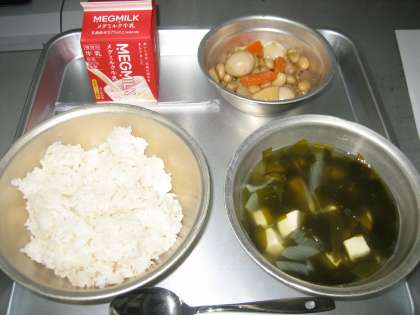 きょうの給食は「麦ごはん・牛乳・豚肉と大豆の中華煮・わかめスープ」です。