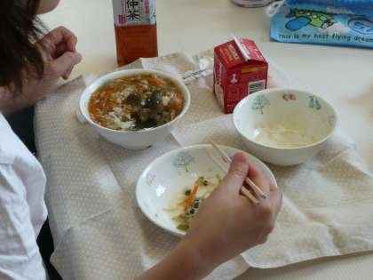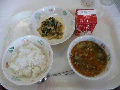 今日の献立は,夏野菜のあんかけごはん,牛乳,もやしのにびたしでした。PTA給食試食会に来られた保護者の皆さんにも食べていただきました。