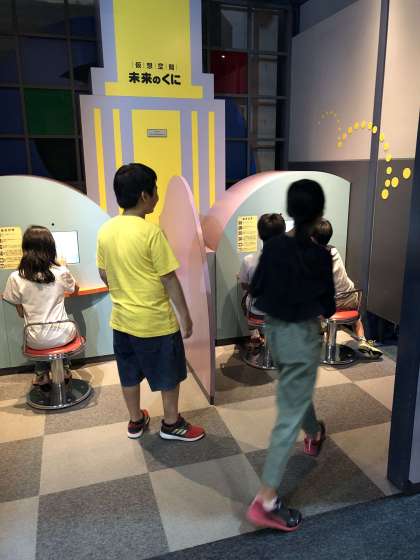その後,屋内の子ども科学館で,グループ活動をしています。自然と科学についての展示を見たり、ゲーム感覚で体験できるブースをまわったりして、楽しく学んでいます。