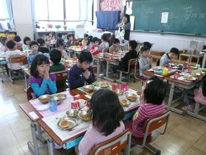 1年生の子どもたちが楽しみにしている給食が12日から始まりました。食べることはもちろんですが,当番の仕事をするのも楽しそうでしたでした。