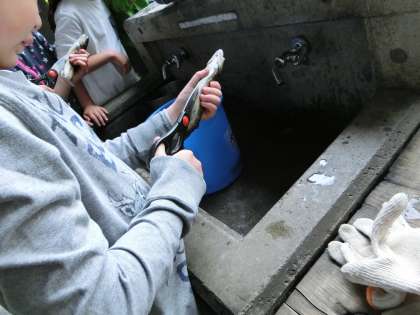 先ほどつかまえた魚をさばき,塩焼きにしていただきました。自分たちが追いかけたとき魚が素早く逃げたのは,身を守るための必死の行動であったことに気づき,そこから命の重み,命を感謝していただくことについても考えました。