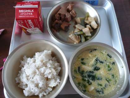 きょうの献立は「麦ごはん・牛乳・なま節とふきの煮つけ・かきたま汁」でした。なま節は昔から食べられてきたものですが,最近は家でもあまり煮て食べることが少なくなってしまいました。1年生はなま節もふきも初めて食べたという子どもが多かったですが,少しずつ味を確かめながら食べてくれていました。ふきやたけのこは,春の食べものです。きょうは春を感じながら食べました。