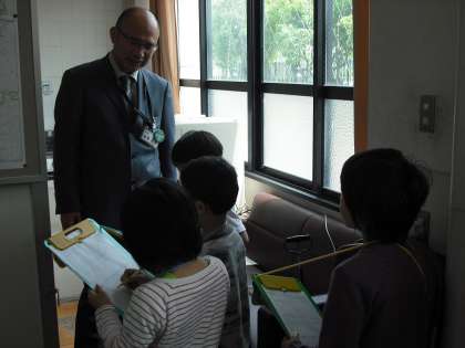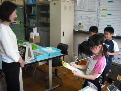 2年生がいろいろな教室をまわってインタビューしています。1年生に学校を案内するための準備をしているのです。去年は,自分たちが教えてもらいましたが,1年たって今度は自分たちがお兄さん・お姉さんとして教える立場になりました。