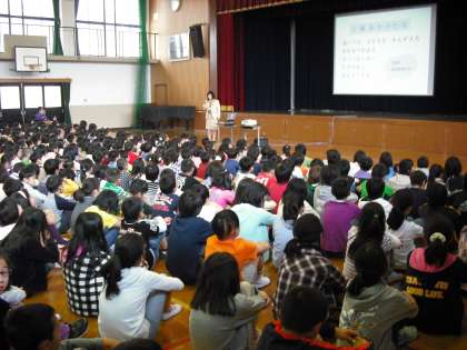 今年から,朝会の初めにみんなで歌を歌う「全校音楽」を始めます。第1回目の歌は,2年生が入学式のお迎えの言葉の中で披露してくれた「スマイル」でした。何回か歌っていくうちにみんなの顔が「スマイル」になっていき,素敵な歌声が体育館の中に響きました。