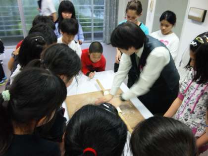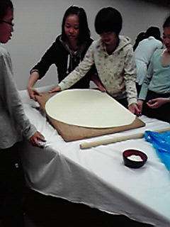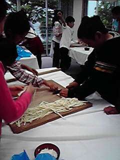 6年生児童は,みんな元気に休暇村讃岐五色台に到着しました。写真はうどん打ち体験をしている様子です。