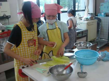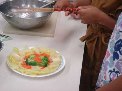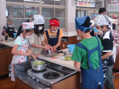 5年生になると家庭科が始まります。特に,調理実習は楽しい時間です。今日は温野菜のサラダを作りました。野菜を切る,ゆでる,盛り付ける一連の活動をグループで分担して楽しく活動していました。