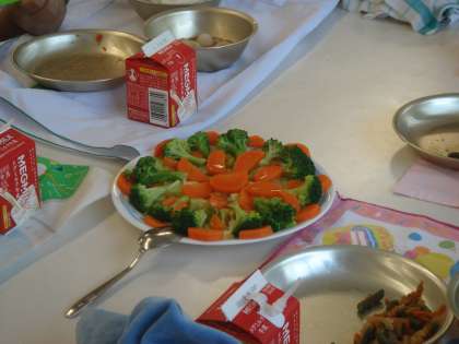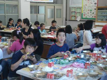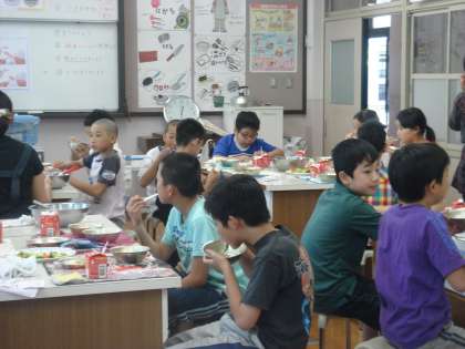 5年のある学級が調理実習で作った野菜サラダを囲んで,給食時間に家庭課室で会食をしました。4・5組の子どもたち3人と交流学習をしている学級ですが,今日は調理実習後の会食となりました。キャベツと人参・ブロッコリー3つの野菜が彩りよく盛り付けてあり,手作りのドレッシングも程よい酸味でおいしいものでした。