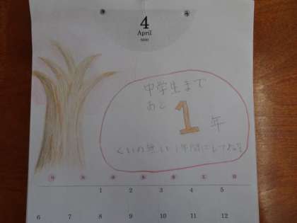 毎月,その時期に合ったデザインが描かれています。4月のページは,最高学年としてスタートするみんなへのメッセージが込められたデザインになっていました。教室に飾っておきますので,またじっくり見てくださいね。