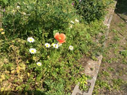 前庭では,ポピーの花が咲いているのを見つけました。モンシロチョウが,キャベツとセイヨウカラシナに卵を産みにきていました。