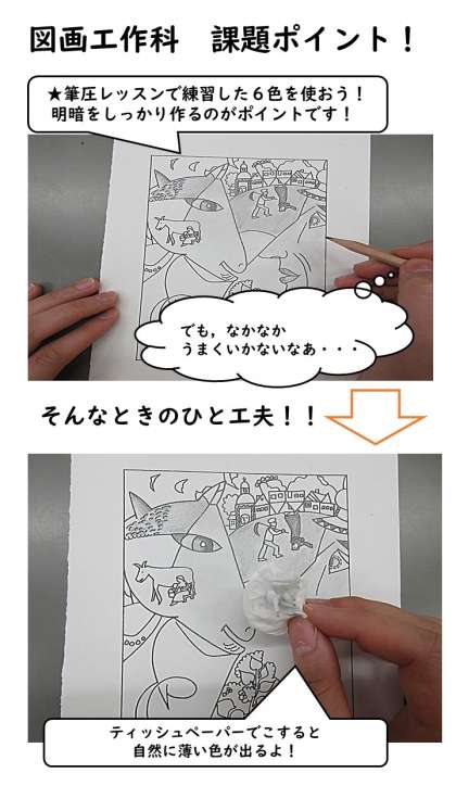 課題に精一杯取り組んでいるみんなへ。木坂先生からの図画工作科課題にはもう取り組みましたか?中には,「まだやれていない・・・」「いまいちやり方が分からない」という人がいるかもしれませんね。そんなときに使える,筆圧レッスン課題のヒントを作りました!「もうやってしまったよ!」という人も,もう一度自分の作品を見直してみて,取り組んでもらっても大丈夫ですよ!ぜひ,見てね☆彡