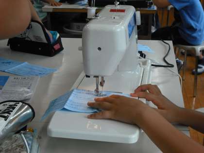 6年生の家庭科で,ミシンの学習が始まりました。上糸をかけて下糸を引っ張り出して…苦戦しながらも,みんな頑張って直線縫いができていました。