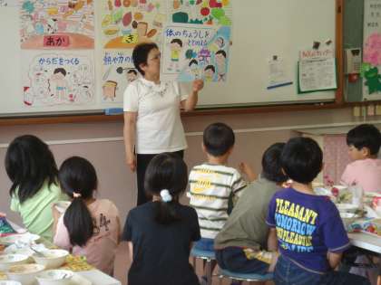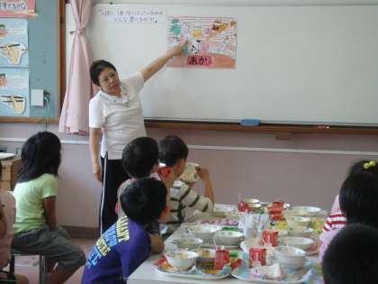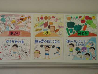 学級ごとに順番にランチルームで給食をしています。その時間は,栄養教諭の澤島先生から食べ物に関するお話を聞いて,食に対する意識を育てています。今日は3年生が,赤・黄・緑3色の食品についてでした。どの色の食品も体には大切な栄養があることを知りました。