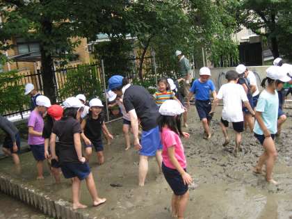 田んぼを耕すどろ田遊びを行いました。