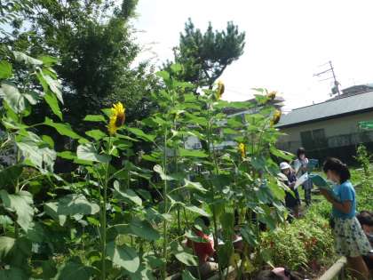 運動場から見えてはいたけれど,児童館からいつも見てはいたけれど,間近に見ると,ヒマワリのあまりの大きさに,みんなびっくり!