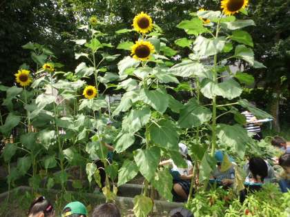 休校中の4月に種まきをしたヒマワリは,実に2mをこえていました。
