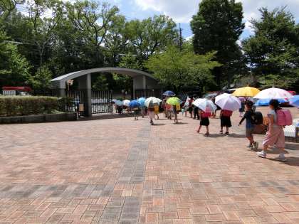台風シーズン到来に備え,集団下校の訓練を行いました。今回は,台風接近時の悪天候状況を想定し,傘を差して地域ごとに集団下校を行いました。傘を差すことで,人との距離をとって集団下校時の密接を避けるとともに,強い日差しから体を守ることにもつながりました。人との距離をとっているので,マスクをはずすこともでき,感染対策と熱中症予防の両方ができることになります。