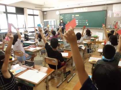 学習問題の予想の場面で,3色カードを使いました。