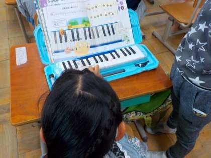 音楽科で,鍵盤ハーモニカを使った学習が始まりました。初めて鍵盤を触る子も多く,みんな興味津々で学習に取り組んでいます。息使いと指使いに気を付けて学習していきます。