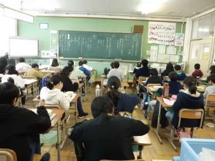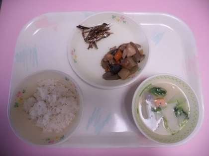 今日の献立は,「麦ごはん・煮しめ・ごまめ・京風みそ汁」でした。月に一度の和(なごみ)献立です。「煮しめの具がやわらかくておいしい」「ごまめがカリカリでおいしい」とお正月料理を楽しみました。しっかり前を向いて,静かにおいしくいただきました。