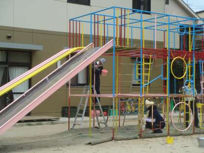 暑い日になりましたが,支部の管理用務員の方々が共同作業に来てくださいました。運動場の遊具やバスケットゴールにペンキ塗りをしてくださいました。見違える美しい遊具になりました。さぞ子どもたちは感激することと思います。お世話になった皆様に厚くお礼申し上げます。