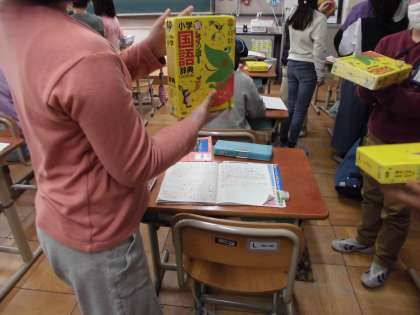 かなり重い辞典を使いました。3種類ののせ方で,体感しました。目をつぶって,真剣に調べている子もいました。