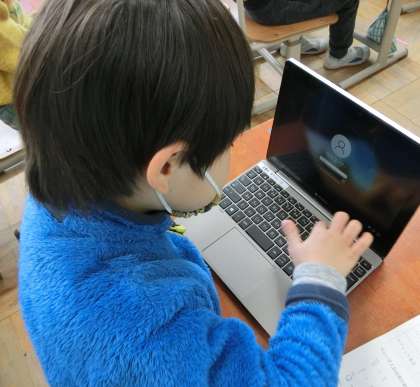 1年生がはじめてタブレットに触れ,コンピュータの使い方を学習しました。使うときの約束をしっかり守ることを学び,ログインのしかたを練習します。小さな手で,一生懸命操作する姿がかわいらしく,ステキです。先生の話もしっかり聞くことができ,「わからなーい」の混乱は,ほとんど見られませんでした。これから練習を繰り返して,どんどん慣れていくことでしょう。とても楽しみです。