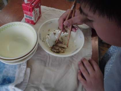 お箸を上手に使って,中骨を外したり,身を取ったりして,とてもきれいに食べています。