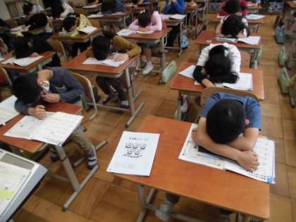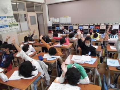 何度か聴いた後,目をつぶって,重なっている部分で手を挙げています。