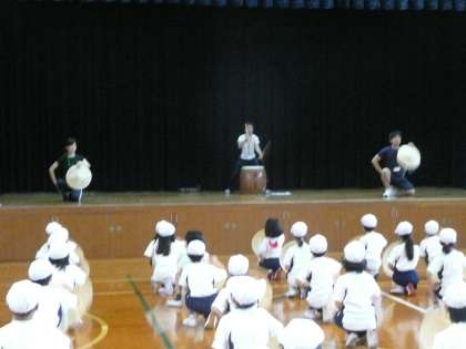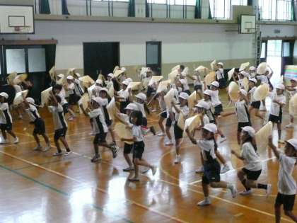 2年生は,4校時に体育館で「まつり花笠」の練習をしました。おそろいの笠を持ち,和太鼓のリズムに合わせて元気におどっていました。