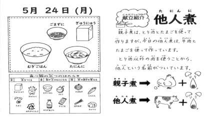 ・「親子煮」とはちがって,牛肉が入っていたので,親子煮にはないおいしさがあっておいしかったです。あと,なぜ親子ではなく他人なのか分かりました。明日からも給食づくりがんばってください。